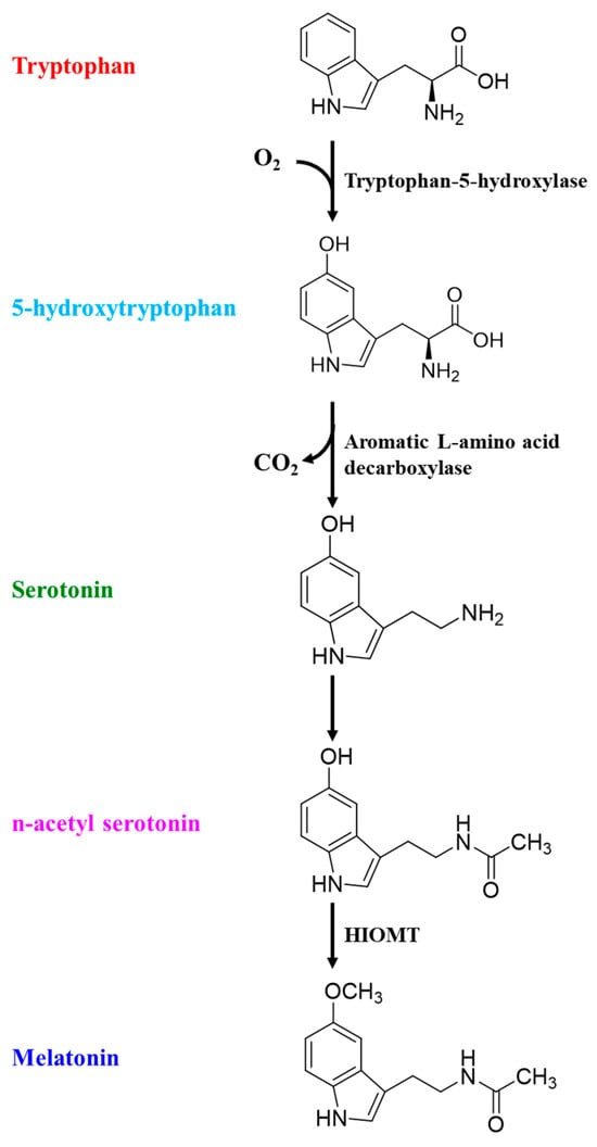 The incidence of sleep disruptions increases with age as the sleep quality gets worse due to well-documented changes in sleep patterns and sleep architecture [14,15]. Poor sleep among the elderly is characterized by delayed onset, decreased latency, difficulty in maintaining sleep, nocturnal shifts in sleep patterns, and overall decreased sleep duration. Polysomnographic studies indicate that aging shifts the pattern and duration of sleep stages as the length of non-rapid eye movement (NREM) sleep stages 1 and 2 (light sleep) increases. Although rapid eye movement (REM) sleep changes also happen, these changes occur later in old age [16]. The age-related micro-architectural changes in sleep structure include decreased sleep spindles and lower k-complex peaks [17]. Collectively, these changes are attributed to increased lethargy and daytime sleepiness. Age-related neurochemical changes in the brain lipid profile, especially decreased brain n-3 contents [18], not only exert a neuroinflammatory pressure but also decrease the bioavailability of tryptophan, which is a precursor to 5-hydroxytryptophan (5-HT, serotonin) [19]. Aging-induced neuroinflammation can also suppress 5-HT production, as indoleamine 2,3-dioxygenase (IDO) activity is upregulated by inflammatory microglia and proinflammatory cytokines [20]. Serotonin is later converted into melatonin, which plays an important role in sleep induction and sleep duration, as studies have pointed towards decreased melatonin concentrations in old age [21] (Figure 2).