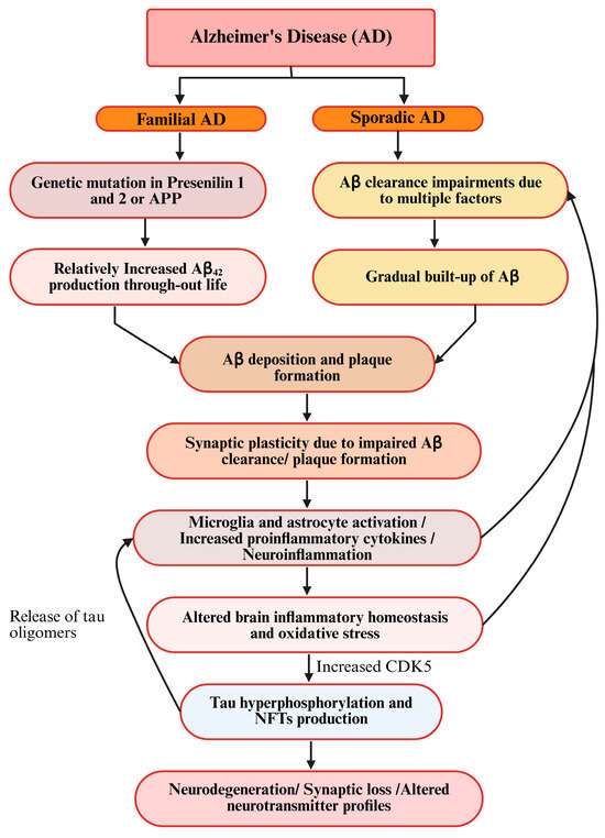 A neuroinflammation-induced increase in proinflammatory cytokines can also initiate or facilitate tau hyperphosphorylation. Studies suggest that IL-6 and IL-1β can activate cyclin-dependent kinase-5 (CDK-5), which is known for tau hyperphosphorylation. Regarding other AD hallmarks, pTau and amyloid-beta (Aβ) exhibit a reciprocal relationship [81]. Aβ initiates tau’s transformation into a toxic form in AD, but toxic tau also amplifies Aβ deposition through a feedback loop. Later on, both Aβ and tau can self-propagate and spread across the brain via prion-like mechanisms, driving neurodegeneration [82,83] (Figure 4).