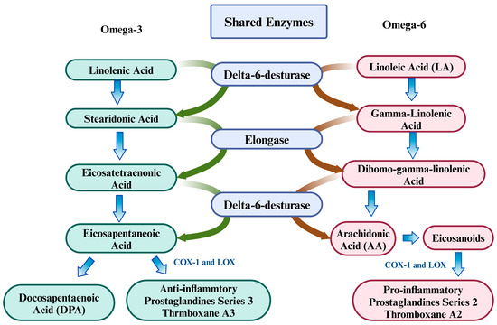 Conversion of n-3 and n-6 into their derivatives using shared enzymes.