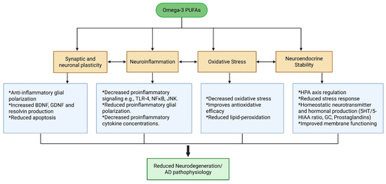 LC n-3 PUFAs can modulate neurotransmission, brain development, neuroplasticity, and cellular signaling [12]. The experimental and epidemiological evidence indicates that n-3 FAs may serve as a potential protective factor against early-stage or mild AD. Several studies have demonstrated an association between low dietary intake of n-3 PUFAs and an elevated risk of cognitive decline, dementia, and AD. A positive correlation between dietary or plasma EPA/DHA levels and memory function in healthy adults has been reported [181]. Conversely, studies show that individuals with mild cognitive impairments (MCI) and AD, frequently exhibit lower levels of EPA and DHA in their plasma [182,183]. Moreover, AD patients’ brain samples indicated lower DHA concentrations compared to those of cognitively normal individuals [184]. A prior study found that higher plasma DHA levels were associated with a 47% reduced risk of all-cause dementia and a 39% lower risk of developing AD [185]. Furthermore, long-term supplementation (6 months) with EPA and DHA has demonstrated the potential to alleviate depressive symptoms and improve cognitive functions in adults experiencing MCI [186]. Some of the therapeutical aspects of AD-related pathological changes are detailed below.