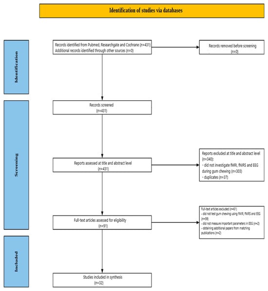 Figure 1 illustrates the screening process. Initially, 431 studies were identified through database searches. Of these, 340 publications were excluded after a review of their abstracts and titles: 303 did not investigate EEG, fMRI, and fNIRS during gum chewing, and 37 were duplicates. Following a detailed full-text review of the remaining 91 papers, 59 studies were further excluded for not addressing EEG, fMRI, and fNIRS during chewing gum. Two EEG studies were excluded for not measuring key EEG parameters during gum chewing Additionally, two fMRI studies were included, after being identified through searches for matching publications. Ultimately, 32 studies were included in the review: 15 fMRI, 12 fNIRS, and 5 EEG, published between 1998 and 2024.
