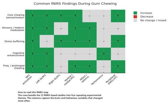 The 12 included fNIRS studies [41,42,43,44,45,46,47,48,49,50,51,52] are presented in Table 2. The fNIRS investigations explored how gum chewing impacts cortical hemodynamics, particularly in the prefrontal cortex (PFC), under varying sensory, cognitive, and emotional conditions. Despite varying focuses—such as flavour, chewing frequency, or stress exposure—several consistent patterns emerged.