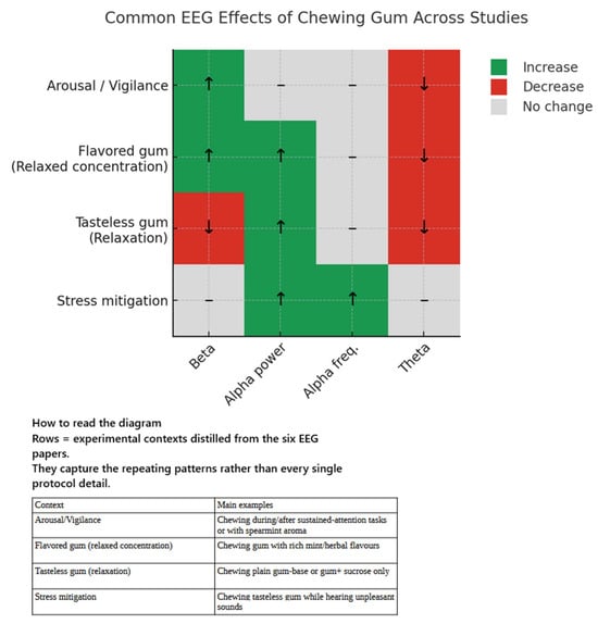 Despite this methodological diversity, the paradigms converge on three shared technical features. First, all employed a block structure with alternating on–off epochs, typically 25 s long, except for the dynamic experiment [31], which subdivided each chew block into five 5 s bins to track intra-block evolution. Second, pacing was consistently maintained at approximately 1 Hz, enforced by a metronome in eleven of fifteen studies; the remainder permitted self-paced chewing after a pre-chew period to stabilise the bolus. Third, rest conditions were sensory-matched: participants either held the gum motionless in one cheek or maintained light centric occlusion, thereby preserving tactile context while eliminating rhythmic proprioception.
