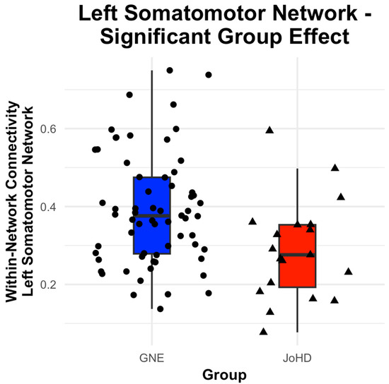 The left Somatomotor Network connectivity was significantly decreased in the JoHD group compared to the control group, F(1, 78.23) = 6.21, p-adjusted = 0.03 (Figure 1). Further, among all participants, left Somatomotor Network was higher in younger vs. older subjects, F(1, 78.97) = 4.67, p-adjusted = 0.04. No other network models were significant (all p-adjusted > 0.05) (Figure 2 and Table 2).