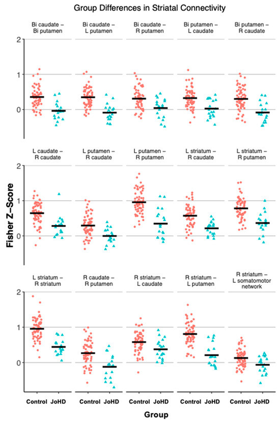 Reduced within-striatal connectivity was repeatedly found in the JoHD group compared to the control group (Table 3, Figure 2). Left, right, and bilateral putamen, caudate, and striatal ROIs were hypo-connected to their contralateral and ipsilateral counterparts apart from the left caudate to both the right and left putamen. Further, the left somatomotor network and right striatum displayed reduced connectivity. No other somatomotor network to striatal ROIs were significant (all p-adjusted > 0.05).