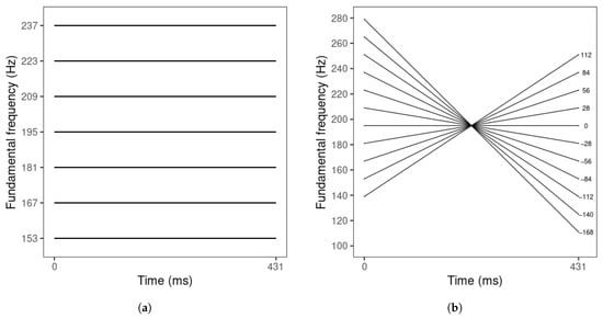 The endpoints of the resynthesized tone contours’ F0 mean and slope values were based on the mean ranges of F0 mean () and slope values () across the two speakers. Based on these productions, F0 mean ranged from 153 to 237 Hz. Intermediate steps between the F0 mean endpoints were determined by a step size of 14 Hz, the maximum just-noticeable-difference value for L1 Mandarin listeners [] (Figure 1a). F0 slope ranged from 112 to −168 Hz/normalized time (t). The onset and offset values of the F0 slope endpoints were derived from Equation (2) (at t = 0 and 1). Then, the onset and offset were adjusted in opposite directions in 14 Hz steps to obtain the onset and offset values of the intermediate steps. Finally, their slope values were derived from Equation (2) (Figure 1b).