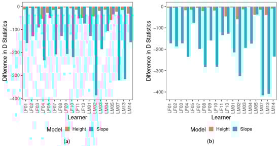 Difference in D statistics between the null model and single-predictor models for all learners for (a) visit 1 and (b) visit 2.