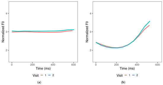The above results demonstrate that the F0 slope-only model resulted in a significant improvement of model categorization accuracy compared to the null model, but the F0 mean-only model did not perform better than the null model that contained no predictor. Therefore, the categorization performance of the F0 mean-only model simply reflected the tone response that was a priori more likely than other tones []. Although the ANOVA yielded a significant main effect of visit, the improvement in model accuracy across visits for the F0 mean-only model did not capture an improvement in categorization performance by this acoustic cue. To confirm whether F0 slope alone resulted in a better categorization performance in visit 2 than in visit 1, a separate paired-sample t test was carried out with visit as the independent variable and model accuracy as the dependent variable for F0 slope model data only. This yielded a significant difference (t(18) = −2.70, p = 0.015), indicating that the F0 slope model had higher model accuracy in visit 2 (63.8%) than visit 1 (58.8%), and therefore, there was an increase in the weighting of this cue in perception.