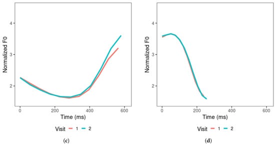 The LDA results are presented in Figure 7. The F0 mean-only model yielded the lowest model classification accuracy among all the models. The classification accuracy of the F0 slope-only model is noticeably higher than that of the F0 mean model but lower than the F0 mean + F0 slope model. The figure displays some increases in classification accuracy from visit 1 to visit 2, especially for the F0 slope-only model.