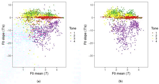 Specifically, Leung and Wang [] asked L1 Mandarin individuals to identify the tone categories of resynthesized tones varying in F0 slope and F0 mean orthogonally. The same group of participants produced the four Mandarin tones, and the F0 slope and F0 mean of these produced tones were obtained. Through a bi-directional statistical learning approach, models were trained using F0 mean or F0 slope of either the perceptual responses or the produced tones. The models were then used to classify the tones from the other domain (i.e., the produced tones or the perceptual stimuli). The results showed that both the perception and production models performed well in classification when F0 slope was used as a factor, whereas the model with F0 mean as a factor performed poorly.