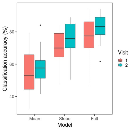 Mean classification accuracy of linear discriminant analysis across visits. The whiskers of the boxplots represent values within 1.5 times of the interquartile range above the 75th and below the 25th percentiles. A dot represents any value outside that range beyond either end of the whiskers. (Mean: F0 mean-only; slope: F0 slope-only; full: F0 slope + F0 mean).