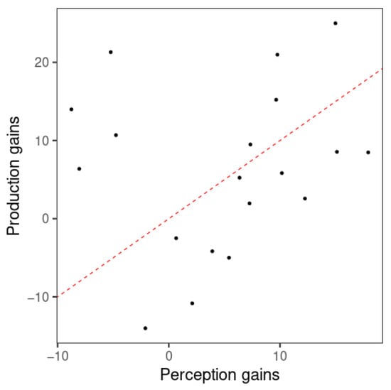 It is also worth comparing the perceptual and production gains to investigate whether there is a close connection between perception and production development. As mentioned above, previous studies did not investigate an L2 perception–production relationship at the acoustic cue level [,]. Based on the findings of these studies, the two domains display a semi-autonomous nature, and it is conceivable that the relationship between perceptual and production gains is also weak when examining the gains through the use of acoustic cues. Additionally, although previous studies generally found a trend of perception leading production in L2 learning, as demonstrated by greater perceptual gains than production gains [,,,], there were conflicting findings on the L2 learning of tones. Previous research showed a production lead in Mandarin learning, since learners’ L2 productions had higher accuracy than perceptual identification [], but also a perception lead, since learners were generally able to accurately perform tone discrimination, while there was much more inter-speaker variability in their productions []. Therefore, it is still uncertain which domain should yield greater improvement.