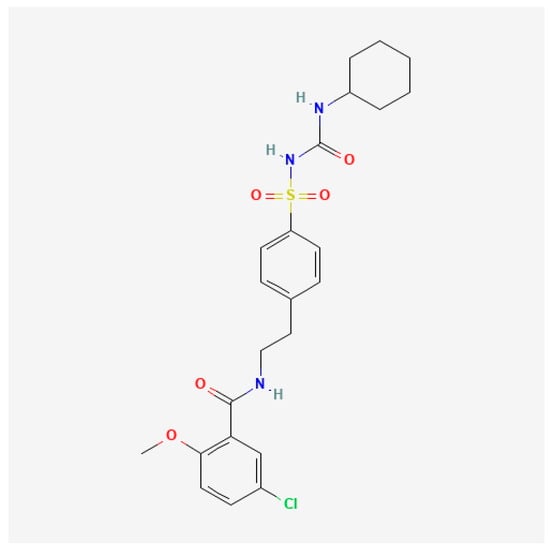 Glibenclamide (5-chloro-N-[2-[4-(cyclohexylcarbamoylsulfamoyl)phenyl]ethyl]-2-methoxybenzamide, C23H28ClN3O5S) [10,11] (Figure 1), a sulfonylurea receptor 1-transient receptor potential melastatin 4 (SUR1-TRPM4) channel blocker, has shown neuroprotective effects by reducing edema and maintaining the integrity of the endothelium and the blood–brain barrier [12,13] in preclinical models of brain injury [14,15]. The SUR1-TRPM4 channel, which is overexpressed following ischemic and hemorrhage insults, plays a critical role in cytotoxic and vasogenic edema by regulating sodium and water influx into brain tissues [16,17]. Blocking this channel has been shown to reduce secondary neuronal damage and improve outcomes in models of ischemic and hemorrhage strokes [14,15].