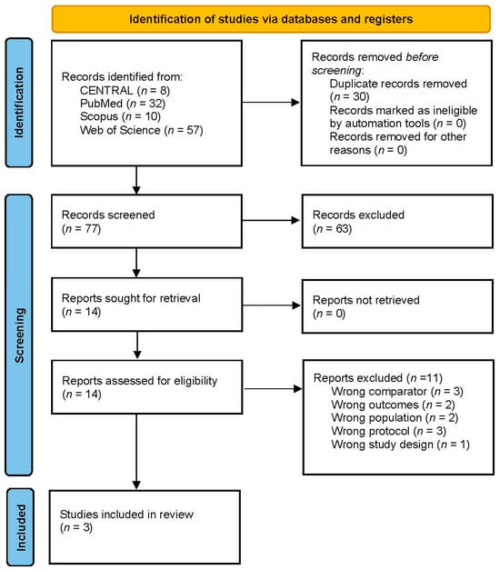 A total of 107 records were identified through our database search. After removing 30 duplicates, 77 records remained for abstract screening. Following the screening of abstracts and titles, 63 records were excluded, leaving 14 studies for full-text review. Of these, 11 studies were excluded, resulting in 3 studies being included in our review. The search and selection process is illustrated in Figure 2 and Figure 3.