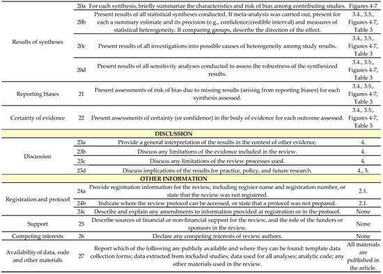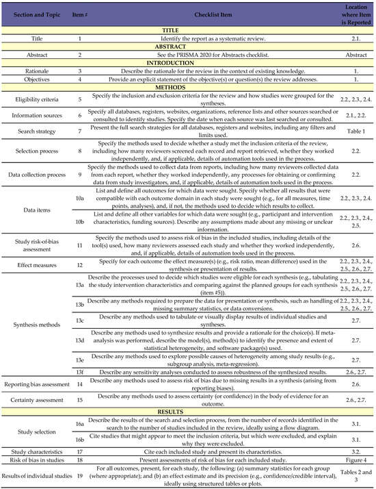 - Page, M.J.; McKenzie, J.E.; Bossuyt, P.M.; Boutron, I.; Hoffmann, T.C.; Mulrow, C.D.; Shamseer, L.; Tetzlaff, J.M.; Akl, E.A.; Brennan, S.E.; et al. The PRISMA 2020 statement: An updated guideline for reporting systematic reviews. BMJ 2021, 372, n71. [Google Scholar] [CrossRef] [PubMed]