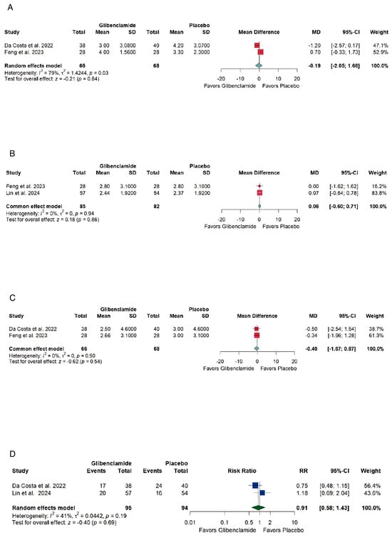 However, several limitations to the current meta-analysis must be acknowledged. The included studies exhibited variability in their designs, dosing regimens, and outcome measures, contributing to heterogeneity in some analyses. The relatively small number of randomized controlled trials (RCTs) and limited sample sizes in individual studies restrict the robustness of conclusions [7,18,27,29,31,32]. Furthermore, the lack of long-term follow-up data prevents a thorough assessment of sustained benefits or risks associated with glibenclamide use. Additionally, the absence of biomarker-guided patient selection may obscure potential benefits in specific subgroups [12,17].