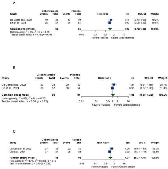 Forest plots of outcomes of a systematic review and meta-analysis of glibenclamide for cerebral edema after aneurysmal subarachnoid hemorrhage. (A) Excellent neurological recovery (mRS [21] 0–1) [18,29], (B) Functional independence [18,29], (C) Independent ambulation [18,29].