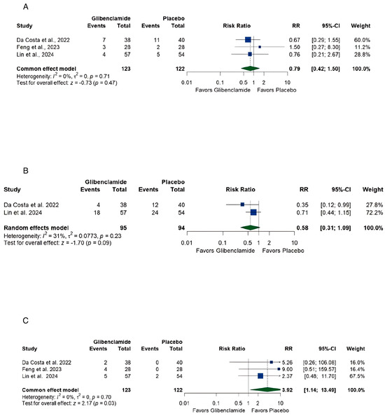 Using the random-effects model the pooled estimate of (A) death was [RR 0.79, (0.42, 1.50)] with no heterogeneity (I2 = 0%, p < 0.01) (Figure 7A), (B) delayed cerebral ischemia, [RR 0.58, (0.31, 1.09)] with low heterogeneity (I2 = 31%, p = 0.23) (Figure 7B), and (C) hypoglycemia, [RR 3.92, (1.14, 13.49)] without heterogeneity (I2 = 0%, p = 0.70) (Figure 7C).