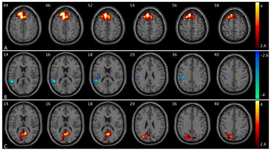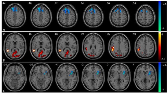 Statistical maps overlaid on T1-weighted images showing altered CBF from low- to high-urge state in healthy controls and OAB participants. (A) CBF increases in the superior frontal, superior medial frontal, anterior cingulate, and supplementary motor regions in healthy controls; (B) CBF decreases in the supramarginal, middle, and superior temporal regions in healthy controls; (C) CBF increases in the precuneus, cuneus, and superior occipital regions in OAB participants from low- to high-urge state. The numbers in the top left corner of the MRI images indicate the z-coordinate (in mm) in the MNI space. The color bars represent t-values.