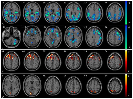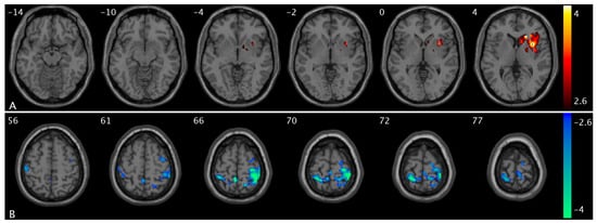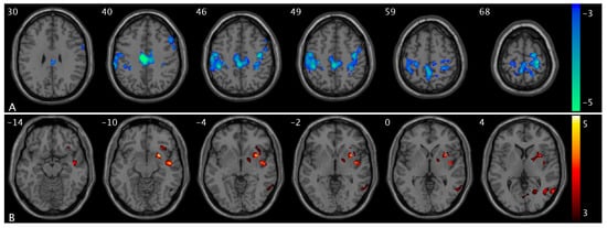 Statistical maps overlaid on T1-weighted images showing altered PCC FC in OAB participants compared to controls at different urge states. (A) Decreased PCC FC with the precentral, postcentral, and paracentral extending to inferior parietal cortex and middle cingulate regions and (B) increased PCC FC with the calcarine, insula, putamen, and pallidum regions in OAB participants compared to healthy controls in the low-urge state. The numbers in the top left corner of the MRI images indicate the z-coordinate (in mm) in the MNI space. The color bars represent t-values.