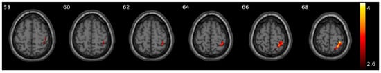 Statistical maps overlaid on T1-weighted images showing treatment effect. Increases in ΔPCC FC (from low- to high-urge state) in the postcentral and parietal regions in OAB/posttreatment compared to OAB/baseline. The numbers in the top left corner of the MRI images indicate the z-coordinate (in mm) in the MNI space. The color bar represents t-values.