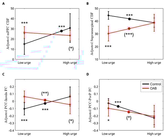 Post hoc interaction effects between group and urge states. As urge states increased from low to high: (A) the control group exhibited a significant increase in CBF in the mPFC region, while the OAB group showed no change; (B) the control group exhibited a significant decrease in CBF, while the OAB group experienced a significant increase in the supramarginal region; (C) the control group displayed a significant increase in PCC-insula FC, while the OAB group experienced a significant decrease in PCC-insula FC; (D) both the control and OAB groups exhibited a decrease in PCC-PocP FC. Bars represent standard deviations. Significance levels are indicated as follows: * 0.01 ≤ p < 0.05, ** 0.001 ≤ p < 0.01, *** p < 0.001, reflecting differences between controls and OABs in the low- and high-urge states and between the low- and high-urge states within each group. Large dots are added to the lines to signify significance. Significance levels in parentheses are derived solely from the post hoc regional analyses, not from the voxel-level analyses.