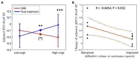 (A) At baseline, the OAB group experienced a decrease in PCC-PocP FC, while posttreatment, the group exhibited an increase in PCC-PocP FC. (B) Relationship between change of symptom (bladder volume at maximum capacity) and change of ΔPCC-PocP FC from low- to high-urge state after treatment in OAB participants. ‘Worsened’ indicates a decrease in bladder volume at maximum capacity after treatment, whereas ‘Improved’ indicates an increase in bladder volume at maximum capacity after treatment. Bars represent standard deviations. Significance levels are indicated as follows: * 0.01 ≤ p < 0.05, ** 0.001 ≤ p < 0.01, *** p < 0.001, reflecting differences between baseline and posttreatment of OABs in the low- and high-urge states and between the low- and high-urge states within each group. Large dots are added to the lines to signify significance. Significance levels in parentheses are derived solely from the post hoc regional analyses, not from the voxel-level analyses. Dash lines indicate the 95% confidence intervals.