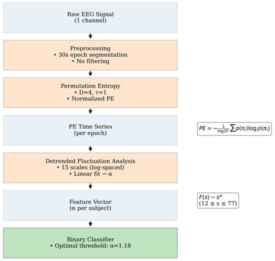Once PE was obtained over time, the FS exponent was calculated by deriving the fluctuation function from Equation (1). Fifteen segment sizes were selected in logarithmic space (base 10) within the range of and fitted with a first-degree polynomial. The FS exponent was computed for each subject condition, and used as a feature parameter to develop a binary classifier. An optimal decision threshold was determined to maximize discriminative performance between pathological (unhealthy) and control (healthy) states. In Figure 1, we show the complete processing workflow.