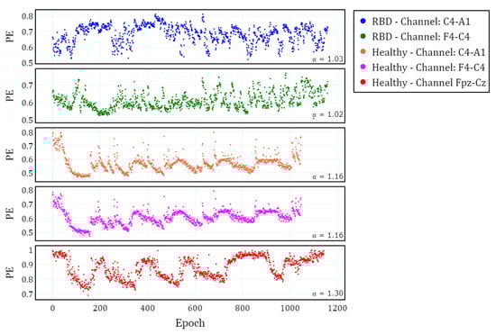 In this section, we present the findings of our analysis, beginning with a visualization of the temporal evolution of permutation entropy (PE) and its fractal scaling exponent . We then proceeded to a detailed statistical analysis to assess differences between RBD and healthy subjects, followed by a classification analysis that maximizes the F1-score to distinguish between both groups. Finally, we grouped all conditions under the FS exponent to differentiate between healthy and unhealthy groups.