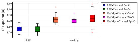 Box plot of the fractal scaling exponent () for different EEG channels in subjects with RBD and healthy controls.
