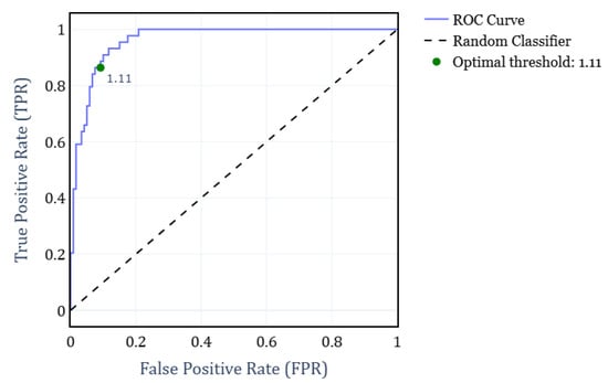 To address the primary objective of distinguishing between RBD and healthy subjects, we developed a binary classifier that determined the subject condition solely based on their FS exponent. For this classifier, we computed the Receiver Operating Characteristic (ROC) curve under different FS thresholds. The analysis was performed by grouping all subjects according to their condition, independently of the EEG channels. Figure 4 shows the resulting ROC curve, where the optimal threshold value of is highlighted. This threshold was determined by maximizing F1-score, yielding a True Positive Rate (TPR) of 0.86 and a False Positive Rate (FPR) of 0.92. Consequently, it results in a weighted accuracy of 0.90, where weighted accuracy is calculated as the average of TPR and FPR, weighted by the proportion of each class.