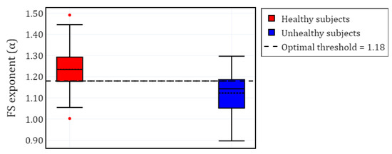 Furthermore, Figure 5 presents a visualization of the healthy and unhealthy populations using boxplots. The unhealthy population includes all values from sleep pathologies, computed for the selected EEG channels. A horizontal line represents the threshold that separates both classes.