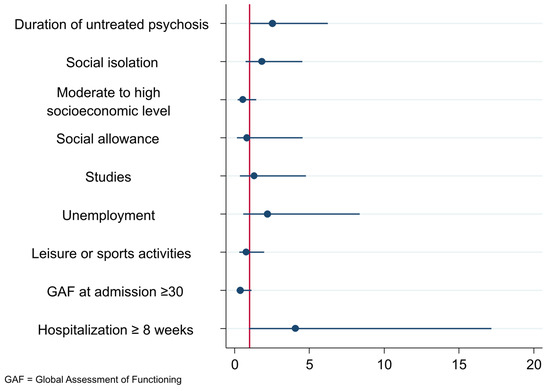 Further adjustment for GAF score at admission and duration of hospitalization (Model 2) slightly attenuated the effect but did not eliminate the significant association (adjusted OR = 2.54; 95% CI: 1.03–6.24; p = 0.043). The forest plot of adjusted OR for this final multivariate model is available in Figure 1.