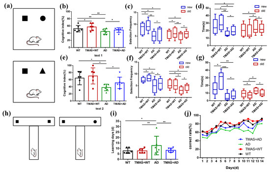 Results of behavioral experiments. (a) Schematic diagram of the novel object recognition; (b) Cognitive index in Test 1; (c) Number of novel objects explored in Test 1; (d) Novel object exploration time in Test 1; (e) Cognitive index in Test 2; (f) Number of new objects explored in Test 2; (g) Novel object exploration time in Test 2; (h) Schematic diagram of the T-maze; (i) Working memory completion time; (j) Correct rate for 14 consecutive days. (* p < 0.05, ** p < 0.01, *** p < 0.001).