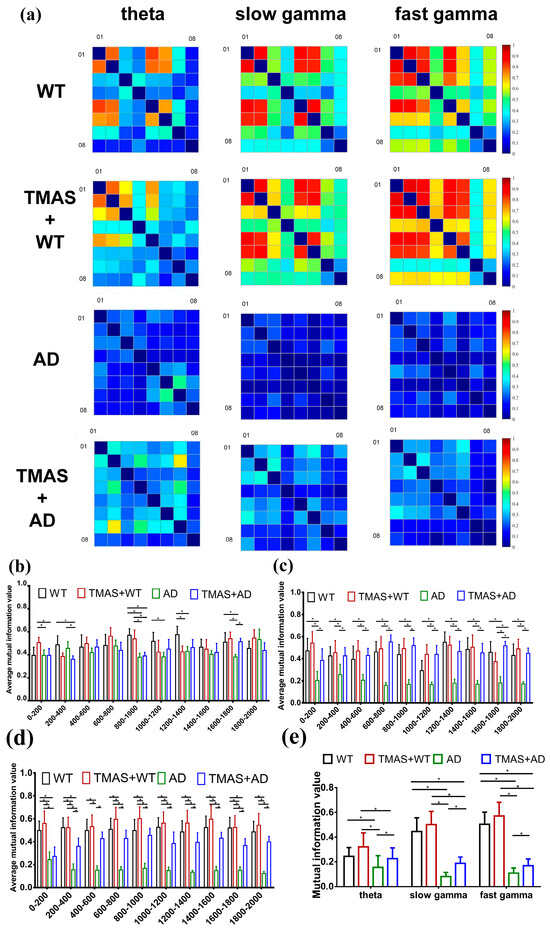 Results of mutual information analysis. (a) A series of mutual information matrices of electrophysiology recordings at different oscillations: theta, slow gamma, fast gamma; (b) theta mutual information in steps of 200 ms; (c) slow gamma mutual information in steps of 200 ms; (d) fast gamma mutual information in steps of 200 ms; (e) average mutual information value. (* p < 0.05).