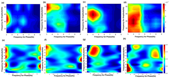 PAC results of theta−gamma in the CA3 region. (a–d) show the PAC results of theta−slow gamma; (a) AD group, (b) TMAS + AD group, (c) WT group, (d) TMAS + WT group. (e–h) show the PAC results of theta−fast gamma; (e) AD group, (f) TMAS + AD group, (g) WT group, (h) TMAS + WT group.