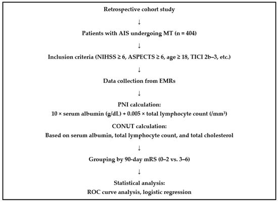 Flowchart illustrating the design and methodology of a retrospective cohort study involving 404 patients with acute ischemic stroke (AIS) who underwent mechanical thrombectomy (MT). The flowchart outlines key steps, including patient inclusion criteria (NIHSS ≥ 6, ASPECTS ≥ 6, age ≥ 18, TICI 2b–3), data collection from electronic medical records (EMRs), assessment of nutritional status using the Prognostic Nutritional Index (PNI) and Controlling Nutritional Status (CONUT) score, patient grouping based on 90-day modified Rankin Scale (mRS) outcomes (0–2 vs. 3–6), and statistical analyses, including ROC curve and logistic regression modeling.