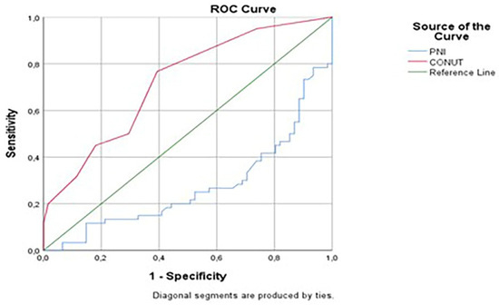 Multivariate logistic regression analysis was performed to identify independent prognostic factors associated with favorable outcomes. Associations were reported as odds ratios (ORs) with 95% confidence intervals (CIs). To assess the predictive accuracy of the nutritional indices, the Receiver Operating Characteristic (ROC) curve analysis was conducted. The area under the curve (AUC) was calculated to compare the predictive performance of the CONUT and PNI scores in determining clinical outcomes. A p-value < 0.05 was considered statistically significant for all analyses.