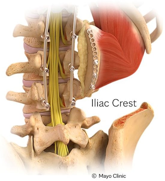 - Reece, E.M.; Davis, M.J.; Wagner, R.D.; Abu-Ghname, A.; Cruz, A.; Kaung, G.; Verla, T.; Winocour, S.; Ropper, A.E. Vascularized Bone Grafts for Spinal Fusion-Part 1: The Iliac Crest. Oper. Neurosurg. 2021, 20, 493–496. [Google Scholar] [CrossRef] [PubMed]