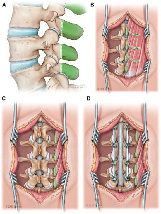 - Bohl, M.A.; Almefty, K.K.; Preul, M.C.; Turner, J.D.; Kakarla, U.K.; Reece, E.M.; Chang, S.W. Vascularized Spinous Process Graft Rotated on a Paraspinous Muscle Pedicle for Lumbar Fusion: Technique Description and Early Clinical Experience. World Neurosurg. 2018, 115, 186–192. [Google Scholar] [CrossRef]