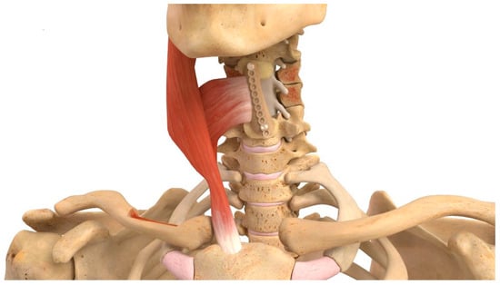 The occipital VBG (O-VBG) is pedicled on the splenius capitis and semispinalis capitis muscles and is indicated for posterior cervical spinal reconstruction in its range of motion from C1 to T1 (Figure 4). Typically, these muscles can only be sacrificed unilaterally to maintain stable rotation of the skull. The primary arterial contribution to Sharpey’s fibers is the deep cervical artery (Table 1). The surgical technique begins with the patient prone, and the neck neutrally positioned. A midline incision is made from the greater occipital protuberance to the target fixation point. First, the fascial plane between the trapezius and semispinalis capitis muscles is identified and dissected. A piece of the occipital bone is identified, bordered inferiorly by the foramen magnum and medially by the medial nuchal line. Dissection is then done subperiosteally around the occipital bone, with care not to disrupt the connections of the periosteum or semispinalis capitis muscle. The occipital bone is removed as one would perform a Chiari decompression. A portion of the occiput or the entirety of the bone may be removed while attached to a unilateral muscle depending on bone requirement. The VBG may even be taken vertically into the foramen magnum. The occipital bone is subsequently secured to the target site using fixation plates and screws [1,2,26].