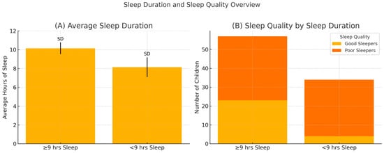 Figure 1. Comparison of average sleep duration and sleep quality among children who sleep less than versus at least 9 h per night. (A) Mean total sleep duration (in hours) with standard deviations for each group. (B) Distribution of sleep quality (good vs. poor sleepers) within each sleep duration group.