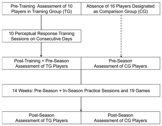 A transition to a greater level of task difficulty was made for the next PRT session that followed a correct response rate of 90 percent or greater (≥36/40). Each of the three progressively higher difficulty levels included two distractor stimuli (circles, rings, or one of each). The two highest difficulty levels introduced variability in the initial location of the target stimulus in relation to the distractor stimuli, and the highest difficulty level increased the movement speed of the stimuli. The 10 players who completed the PRT program performed a follow-up VR test that corresponded to the difficulty level of the baseline test on the day after the tenth training session. The remaining 16 players who did not train completed the baseline VR test 1–3 days prior to the first pre-season practice session. Thus, the follow-up tests for the 10 training group (TG) players and the baseline tests for the 16 untrained comparison group (CG) players were designated as pre-season tests, which were compared to post-season tests administered at the end of the 14-week period of practice sessions and games. Figure 1 presents a flowchart that depicts the sequence of VR testing and training.