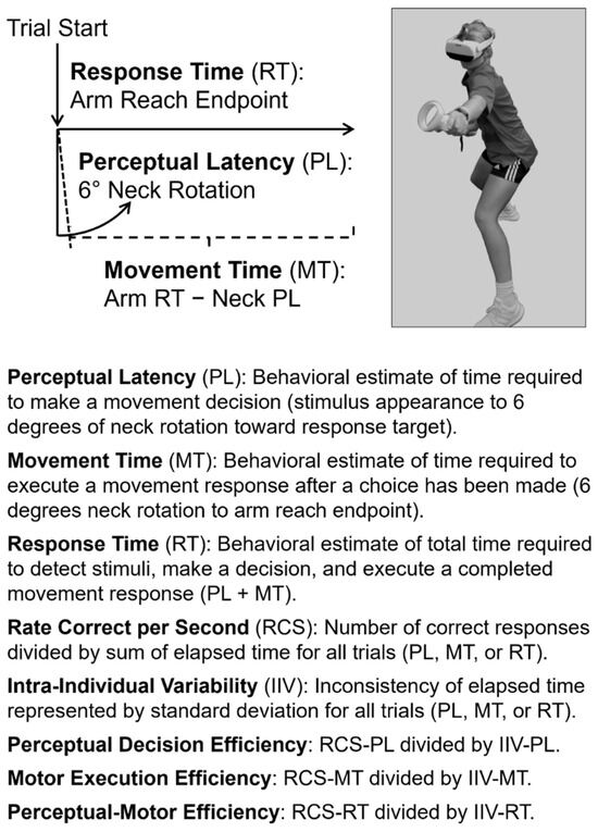 To convert our behavioral data into components that best align with those of the drift–diffusion model, a criterion is needed to separate the decision-making process from the execution of the chosen directional neuromuscular response. Because a perceptual-motor response is not initiated until after a decision has been made [21], the onset of eye, neck, arm, or whole-body movement can be used to define the end of the perceptual decision-making process [70,71]. Extremely rapid multidirectional eye movements are required to detect moving visual stimuli of different types and different locations across the visual field of view, whereas body segments exhibit unidirectional movements toward a chosen response target [72]. Hand controller sensors provide a precise quantification of the location and speed of the arm-reaching response endpoint, but the hand controller position between trial initiation and the onset of a chosen response can be highly variable. The need to maintain the head in a forward-facing neutral position for optimal visualization of both the left and right peripheral fields on the VR headset display provides a highly reproducible starting position of the neck, which is followed by a required unidirectional rotational movement of the neck to visualize a virtual response target located beyond the peripheral limit of the initial field of view. Sensors within the VR headset track the angular position within the transverse plane and the speed of angular displacement, which demonstrate a sudden increase in the rate of neck rotation beyond six degrees. Thus, subtraction of the total perceptual-motor response time (i.e., visual stimulus appearance to hand controller response endpoint) from PL (i.e., visual stimulus appearance to six degrees of neck rotation) may provide the most precise estimate of movement time (MT) for motor response execution. The comparison of metrics derived from these PL and MT intervals may be found beneficial to distinguish between perceptual versus motor impairment as a primary source of dysfunction [16].
