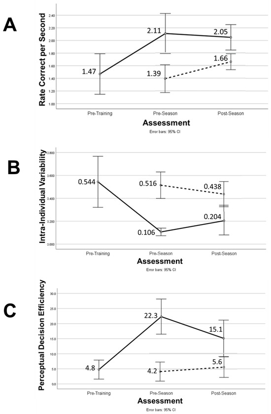 Pre- to post-training (i.e., pre-season) and post-season changes in (A) Rate Correct per Second, (B) Intra-Individual Variability, and (C) Perceptual Decision Efficiency for training group (solid lines) and pre- to post-season changes for comparison (no training) group (dashed lines). Numerical values are means derived from original (untransformed) data and error bars define corresponding 95% confidence intervals for the mean values. All pre- to post-training changes and group differences for pre-season and post-season were statistically significant (p < 0.05).