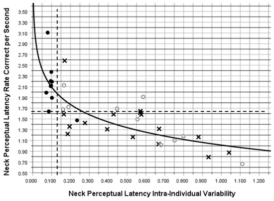 Inverse logarithmic correlation (curved solid line) between the Rate Correct per Second (RCS) and Intra-Individual Variability (IIV) performance metrics for neck perceptual latency at baseline (Spearman’s Rho = −0.795; p < 0.001). White circles identify baseline (pre-training) values for the 10 training group players and Xs identify baseline (pre-season) values for 16 untrained players. Dashed lines identify cut points for RCS (≤1.64) and IIV (≥0.134) that prospectively discriminate players who sustained an injury from those who remained uninjured for the entire season. Black circles identify post-training (pre-season) values for the 10 training group players.