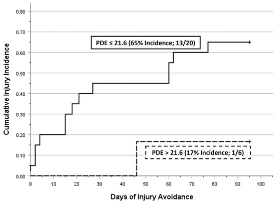 A total of 21 injuries were sustained by 14 players (i.e., 2 players sustained 3 injuries, 3 players sustained 2 injuries, and 9 players sustained a single injury), each of which involved the core or lower extremity: 3 low back, 3 groin/hip, 3 thigh, 6 knee, and 6 lower leg injuries. Group membership did not demonstrate a strong association with injury incidence, which was 63% (10/16) among CG players compared with 40% (4/10) among TG players (OR = 2.50). However, receiver operating characteristic analysis identified pre-season values for neck RCS-PL ≤ 1.64 (79% Sensitivity; 58% Specificity; OR = 6.67) and neck IIV-PL ≥ 0.134 (79% Sensitivity; 50% Specificity; OR = 3.67) as better predictors of a core or lower extremity injury. The best discriminator between injured versus non-injured status was PDE ≤ 21.6 (93% Sensitivity; 42% Specificity; OR = 9.29). Among players who exhibited a high pre-season level of PDE (>21.6), 100% (6/6) were in the TG, and their negative predictive value (i.e., injury avoidance) was 83% (5/6). Figure 5 presents a Kaplan–Meier time to event comparison of cumulative injury occurrences for 20 players with a pre-season PDE of ≤ 21.6 versus the 6 players with a pre-season PDE of > 21.6 (Mantel–Cox Log Rank p = 0.059).