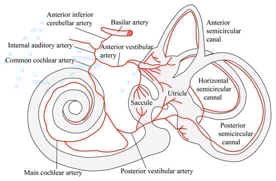 The vascular supply of the inner ear is provided by the labyrinthine artery, which is a single terminal artery with minimal collaterals that originates most often (83.6%) from the AICA and occasionally (in 12.3%) from the basilar artery [15,16] (see Figure 1). It consists of three branches as it enters the inner ear: the anterior vestibular artery (AVA), the main cochlear artery (MCA), and the vestibulocochlear artery (VCA), with the latter two originating from the common cochlear artery [17]. The AVA irrigates the anterior and lateral semicircular canals, the utricle, and a small part of the saccule. The MCA is in charge of the blood supply to the apical three-fourths of the cochlea, i.e., its apical and middle turns. The VCA supplies the basal one-fourth of the cochlea through the cochlear branch of the VCA, and the saccule and the posterior semicircular canal through the vestibular branch of the VCA (i.e., the posterior vestibular artery). The arterial supply to the cochlea can be MCA-dominant or VCA-dominant [15].