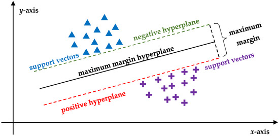 Simplified scatter plot outlining a hypothetical SVM-based binary classification. The two types of points represent different types of lesions (e.g., blue triangles → benign versus purple crosses → malignant) and the axes correspond to specific features (e.g., y-axis → size and x-axis → density). The positive and negative hyperplanes indicate the thresholds for classifying a lesion as benign or malignant, respectively, while the maximum margin hyperplane is positioned in a way that maximizes the pooled perpendicular distance between the two classes. SMVs aim to identify this line to optimize the separation between the classes and minimize the risk of misclassification. To do so, they focus on the points closest to the maximum margin hyperplane (support vectors), which influence the position of the line. The greatest possible distance between the support vectors of the two classes is called the maximum margin; greater maximum margins indicate better models that are less likely to misclassify new data. SVM = support vector machine.