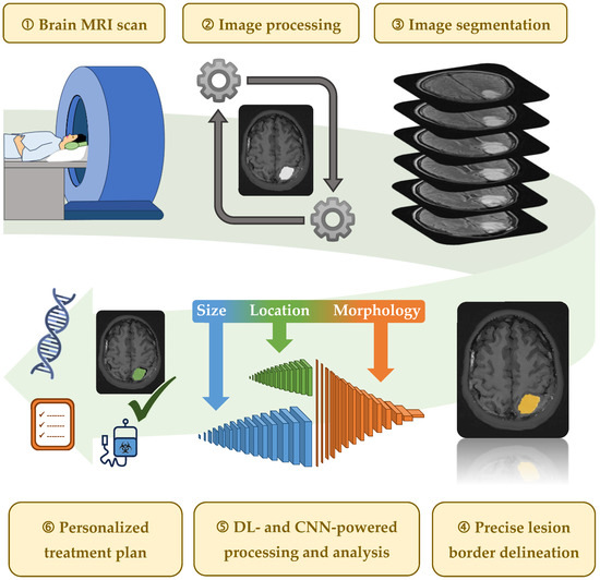 Step-by-step workflow depicting how AI-driven MRI-derived image processing, segmentation, and analysis contribute to precise lesion identification and patient-tailored treatment planning in neuro-oncology. AI = artificial intelligence; MRI = magnetic resonance imaging.